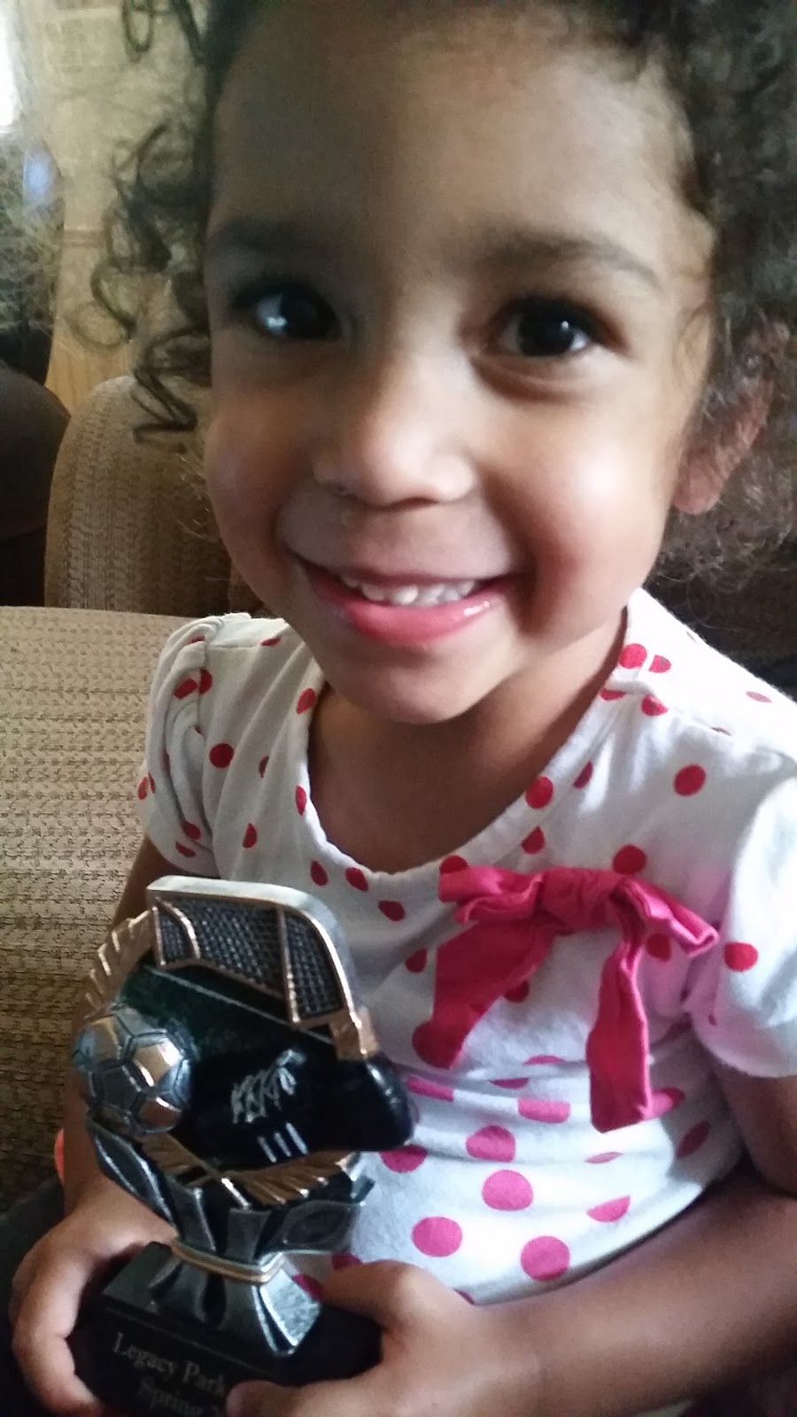 She was happy about getting a trophy. She asked: "did I get this for winning?" "um.... no... that's not how sports are run these days. You got a trophy for playing." She actually seemed sort of mad about that -- she screamed "no - I got it for winning~"
