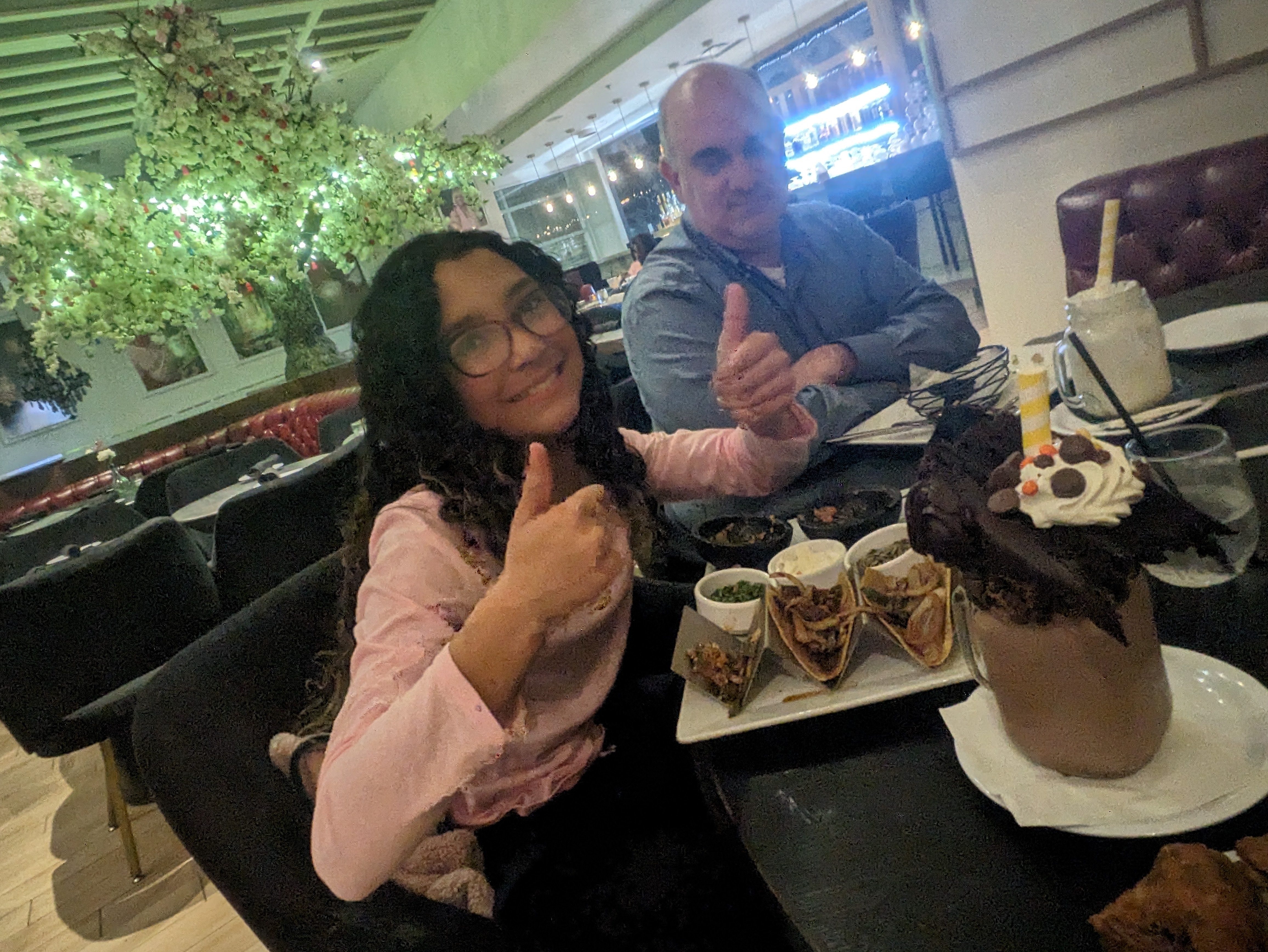 We took him to a restaurant that specializes in celebrating events.... and - this place was a bit over the top! The name - Sugar Factory - says it all. They have a candy store in the front where you wait and the desserts in the restaurant are insane! Mercer ordered a "volcano explosion" shake: a chocolate shake with a donut and 2 brownies on top!